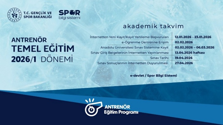 Temel Eğitim uzaktan eğitim modeli ile Anadolu Üniversitesi Sürekli Eğitim Uygulama ve Araştırma Merkezi bünyesinde yürütülmektedir. Temel Eğitim başvuruları 12-23 Ocak 2026 tarihleri arasında e-Devlet Kapısı-GSB-Spor Bilgi Sistemi üzerinden gerçekleştirilecektir. Başvurularını yapan adayların belirtmiş oldukları e-posta adresine referans numarası iletilecektir. Antrenör temel eğitim ve kayıt yenileme (bütünleme) sınav ücreti ödemelerini referans numaraları ya da Türkiye Cumhuriyeti Vatandaşlık numaraları ile 12 Ocak 2026 saat 14:00' dan, 23 Ocak 2026 saat 17:00'a kadar Ziraat Bankası Şube/Atm ve Mobil (Kurumsal Ödemeler/Gençlik ve Spor Bakanlığı Kursiyer ödemeleri) ödeme kanallarından gerçekleştirebilecektir. Temel Eğitim başvuru ücretleri ilk kayıt için 1500 TL, bütünleme başvuruları için 1100 TL'dir.