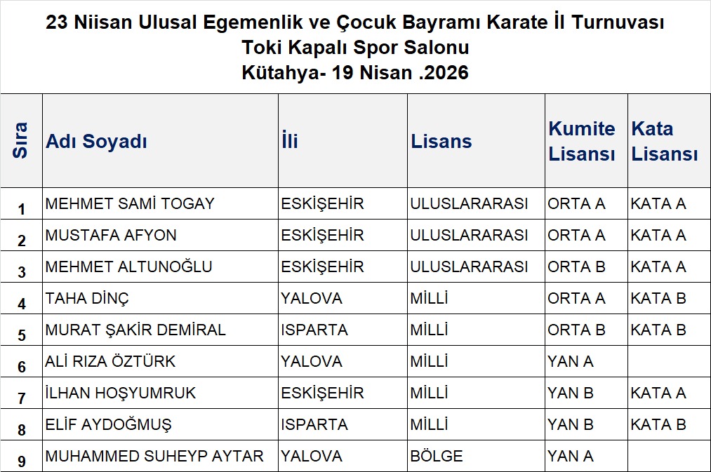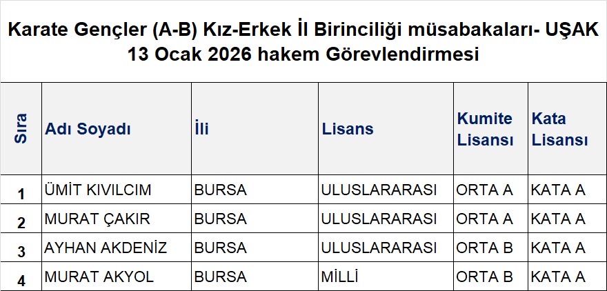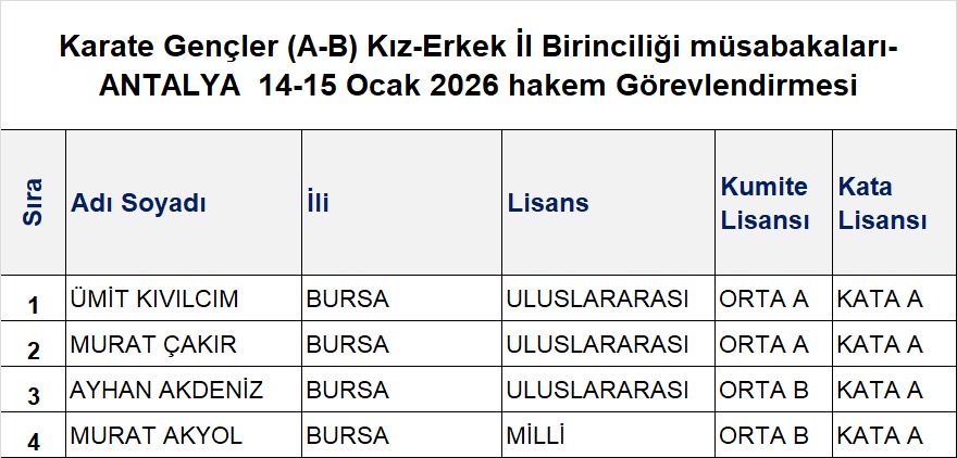 <p style="caret-color: rgb(111, 111, 111); color: rgb(111, 111, 111); font-family: Roboto, sans-serif; text-align: justify;">Türkiye Büyükler, İşitme Engelliler, Para Karate ve Veteranlar Karate Şampiyonası 21-23 Şubat 2025 tarihlerinde Trabzon Beşirli Spor Kompleksinde düzenlenecektir.</p><p style="caret-color: rgb(111, 111, 111); color: rgb(111, 111, 111); font-family: Roboto, sans-serif; text-align: justify;"><span style="font-size: 14pt;"><a title="Büyükler-veteran ve İşitme Engelliler Türkiye Şampiyonası" href="https://karate.gov.tr/uploads/files/BUYUKLER%20SAMPIYONASI%20TRABZON/B%C3%BCy%C3%BCkler-veteran%20ve%20%C4%B0%C5%9Fitme%20Engelliler%20T%C3%BCrkiye%20%C5%9Eampiyonas%C4%B1.pdf" style="color: rgb(209, 124, 120); text-decoration: none; outline: currentcolor;">Şampiyona Reglamanı</a></span></p><p style="caret-color: rgb(111, 111, 111); color: rgb(111, 111, 111); font-family: Roboto, sans-serif; text-align: justify;"><span style="font-size: 14pt;"><a title="parakaratereglaman25trabzon (son)" href="https://karate.gov.tr/uploads/files/BUYUKLER%20SAMPIYONASI%20TRABZON/parakaratereglaman25trabzon%20(son).pdf" style="color: rgb(209, 124, 120); text-decoration: none; outline: currentcolor;">Para Karate Reglaman</a></span></p><p style="caret-color: rgb(111, 111, 111); color: rgb(111, 111, 111); font-family: Roboto, sans-serif; text-align: justify;"><span style="font-size: 14pt;"><a title="ampiyona Programı99" href="https://karate.gov.tr/uploads/files/BUYUKLER%20SAMPIYONASI%20TRABZON/ampiyona%20Program%C4%B199.pdf" style="color: rgb(209, 124, 120); text-decoration: none; outline: currentcolor;">Şampiyona Programı</a></span></p><p style="caret-color: rgb(111, 111, 111); color: rgb(111, 111, 111); font-family: Roboto, sans-serif; text-align: justify;"><a href="https://docs.google.com/forms/d/e/1FAIpQLScvw9cnN9f6lbQmv9ZuFVYq8rU_dS1zzm8eWZ8gAwgKqZv3jA/viewform?usp=dialog" target="_blank" rel="noopener" style="color: rgb(209, 124, 120); text-decoration: none; outline: currentcolor;"><span style="font-size: 14pt;">Takım Kata Başvuru</span></a></p><p style="caret-color: rgb(111, 111, 111); color: rgb(111, 111, 111); font-family: Roboto, sans-serif; text-align: justify;"><span style="font-size: 14pt;"><a title="Görevli Hakemler" href="https://karate.gov.tr/uploads/files/BUYUKLER%20SAMPIYONASI%20TRABZON/G%C3%B6revli%20Hakemler.pdf" style="color: rgb(209, 124, 120); text-decoration: none; outline: currentcolor;">Görevli Hakemler</a></span></p><p style="caret-color: rgb(111, 111, 111); color: rgb(111, 111, 111); font-family: Roboto, sans-serif; text-align: justify;"><span style="font-size: 14pt;"><a title="Organizasyon Görevlileri11" href="https://karate.gov.tr/uploads/files/BUYUKLER%20SAMPIYONASI%20TRABZON/Organizasyon%20G%C3%B6revlileri11.pdf" style="color: rgb(209, 124, 120); text-decoration: none; outline: currentcolor;">Organizasyon Görevlileri</a></span></p><p style="caret-color: rgb(111, 111, 111); color: rgb(111, 111, 111); font-family: Roboto, sans-serif; text-align: justify;">Not: Müsabakada görevli hakemler katılım durumlarını belirtmek için aşağıdaki formu doldurmaları gerekmektedir.</p><p style="caret-color: rgb(111, 111, 111); color: rgb(111, 111, 111); font-family: Roboto, sans-serif; text-align: justify;">*Katılım sağlayan veya sağlayamayan herkesin formu ivedilikle doldurması rica olunur.</p><p style="caret-color: rgb(111, 111, 111); color: rgb(111, 111, 111); font-family: Roboto, sans-serif; text-align: justify;"><span style="font-size: 14pt;"><a title="Katılım Formu" href="https://docs.google.com/forms/d/e/1FAIpQLSdtcr3M1pqAz-UHTwmE6Jld2ya3yXQ78sYE9-JAS2_wPxWwvw/viewform?usp=dialog" style="color: rgb(209, 124, 120); text-decoration: none; outline: currentcolor;">Katılım Formu</a></span></p><p style="caret-color: rgb(111, 111, 111); color: rgb(111, 111, 111); font-family: Roboto, sans-serif; text-align: justify;"><span style="font-size: 14pt;">Not:</span><span style="font-size: 14pt;">Müsabakada görev alacak Teknik Kurul Üyelerimizin izin talep etmesi için aşağıda yer alan izin talep formunu doldurmaları gerekmektedir.</span></p><p style="caret-color: rgb(111, 111, 111); color: rgb(111, 111, 111); font-family: Roboto, sans-serif; text-align: justify;"><span style="font-size: 14pt;"><a title="Teknik Kurul İzin Talep Formu" href="https://docs.google.com/forms/d/e/1FAIpQLScygsJGmO3sl2jWZThY0qsTJRiidTeFDvXYBq9EDe5EV-SVMA/viewform?usp=dialog" style="color: rgb(209, 124, 120); text-decoration: none; outline: currentcolor;">Teknik Kurul İzin Talep Formu</a></span></p><p style="caret-color: rgb(111, 111, 111); color: rgb(111, 111, 111); font-family: Roboto, sans-serif; text-align: justify;">KONAKLAMA</p><p class="p1" style="caret-color: rgb(111, 111, 111); color: rgb(111, 111, 111); font-family: Roboto, sans-serif; text-align: justify;"><span class="s1">Trabzon da yapılacak olan Türkiye Büyükler, İşitme Engelliler, Para Karate ve Veteranlar Karate Şampiyonasında görev alan hakemlerimiz, organizasyon ve federasyon görevlilerimiz aşağıda belirtilen yerleşkelerde 20-23 Şubat 2025 tarihlerinde konaklayabileceklerdir. </span></p><p class="p2" style="caret-color: rgb(111, 111, 111); color: rgb(111, 111, 111); font-family: Roboto, sans-serif; text-align: justify;">Cebeci Yurt Müdürlüğü (Kadın Konaklama) - 25 Kişi</p><p class="p2" style="caret-color: rgb(111, 111, 111); color: rgb(111, 111, 111); font-family: Roboto, sans-serif; text-align: justify;">Adres: Söğütlü Mh. Kanuni Sultan Süleyman Cad. No: 5/A Akçaabat/Trabzon</p><p class="p2" style="caret-color: rgb(111, 111, 111); color: rgb(111, 111, 111); font-family: Roboto, sans-serif; text-align: justify;">Münür Ozkurt Erkek Öğrenci Yurdu (Erkekler Konaklama) - 75 Kişi</p><p class="p1" style="caret-color: rgb(111, 111, 111); color: rgb(111, 111, 111); font-family: Roboto, sans-serif; text-align: justify;"><span class="s1">Adres: SöğütlüMahallesi Camii,